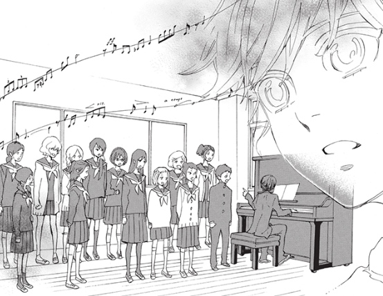 Ce tome 2 se consacre au personnage de Akitoshi Betsuyaku, le président de la chorale. Son histoire m’a touché. Il vit dans une famille de musiciens prodige et pour eux, ce dernier n’est jamais à la hauteur de leur espérance. Par orgueil, il refuse l’aide des autres et refuse d’être perçu comme quelqu’un d’ordinaire. C’est un signe de défaite selon lui. C’est un garçon plutôt mature dans sa manière de penser et on suit ses diverses réflexions où il sait ce qu’il aimerait devenir.