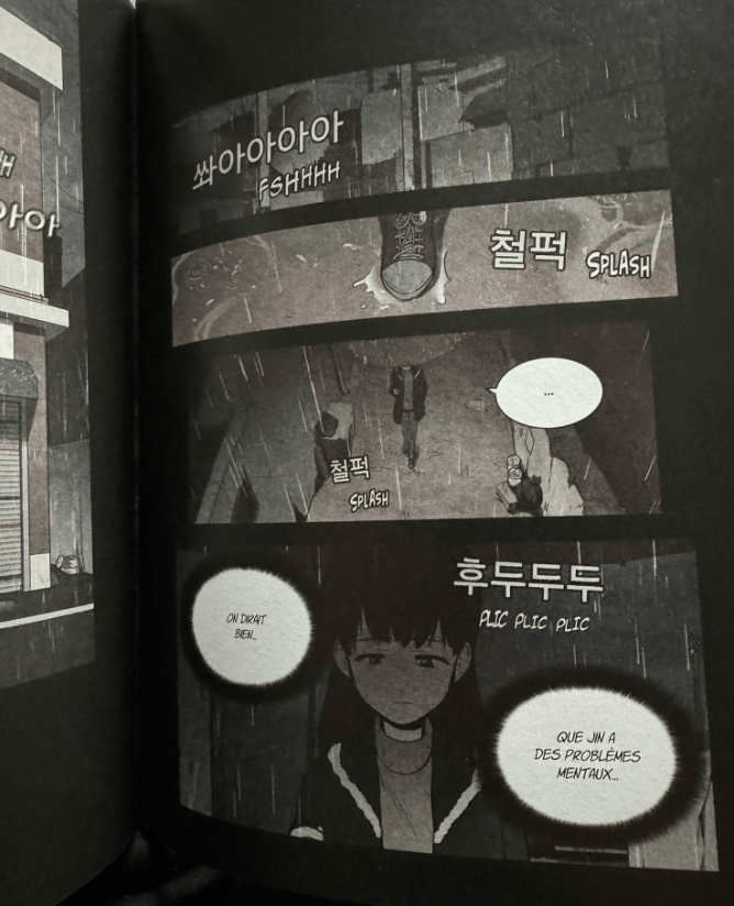 Dans ce tome, la relation entre Jin et Gyeon est approfondie et en étant au plein cœur d’une histoire sordide et tordue, je trouve leur couple touchant. Ça apporte un peu de baume au cœur. Bien qu’ils soient attachants l’un comme l’autre, leur relation cependant est loin d’être un long fleuve tranquille.